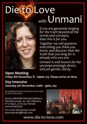 Ao contrário da maioria das pessoas, desde criança, Unmani nunca se sentiu identificada com o papel que parecia estar a desempenhar enquanto pessoa que vive uma vida. Entretanto sentia-se muito perdida e sozinha num Mundo que toda a gente parecia levar tão a sério. Depois de anos de pesquisa para encontrar uma maneira de sair dessa dor, ela conheceu na Índia uma mestra Zen alemã chamada Dolano. Com ela, Unmani reconheceu que o que procurava sempre tinha estado aqui . Ela acordou do sonho, o tempo parou e a busca terminou. Unmani começou a realizar encontros e retiros, três anos mais tarde. Unmani é o autora de dois livros “I am Life itself“ e “Die to Love” e encontra-se a escrever um terceiro livro. Saia mais…